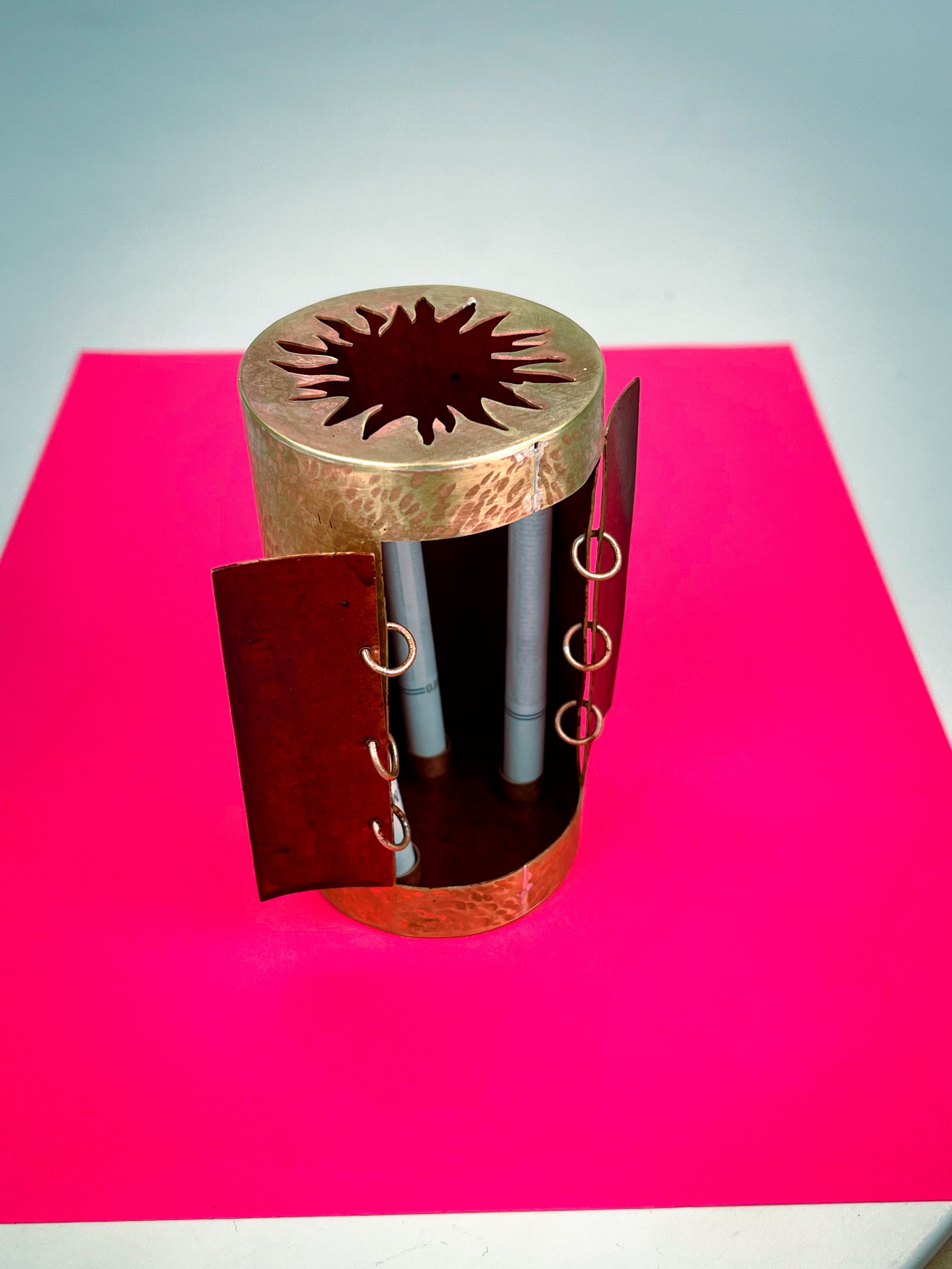 May 2022 I made this reliquary box for into to jewelry to hold the memory of cigarettes around my enviroment growing up. A memory from when I was a kid is being in the dining room with all my aunties knitting and smoking up the room. I kind of took on the habit for a little and still do from time to time so that the sensory experience smoking is can bring me back to my experience in Mexico. I remember I wanted to put that habit to sleep with this piece.